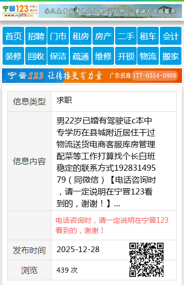 男22岁已婚有驾驶证c本中专学历在县城附近居住干过物流送货电商客服库房管理配菜等工作打算找个长白班稳定的联系方式19283149579(同微信) 【电话咨询时,请一定说明在宁晋123看到的,谢谢!】 |