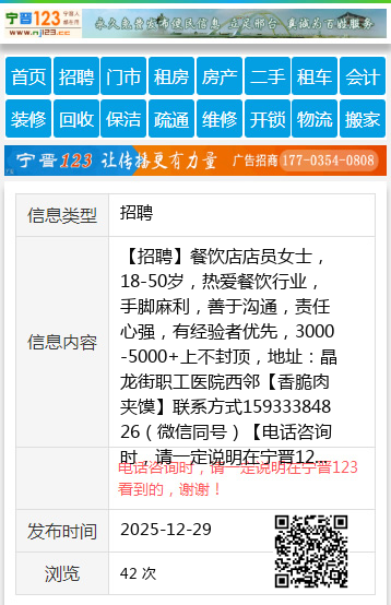 【招聘】餐饮店店员女士,18-50岁,热爱餐饮行业,手脚麻利,善于沟通,责任心强,有经验者优先,3000-5000+上不封顶,地址:晶龙街职工医院西邻【香脆肉夹馍】联系方式15933384826(微信同号) 【电话咨询时,请一定说明在宁晋123看到的,谢谢!】 |