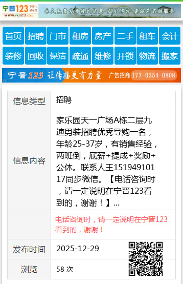 家乐园天一广场A栋二层九速男装招聘优秀导购一名,年龄25-37岁,有销售经验,两班倒,底薪+提成+奖励+公休。联系人王15194910117同步微信。 【电话咨询时,请一定说明在宁晋123看到的,谢谢!】 |