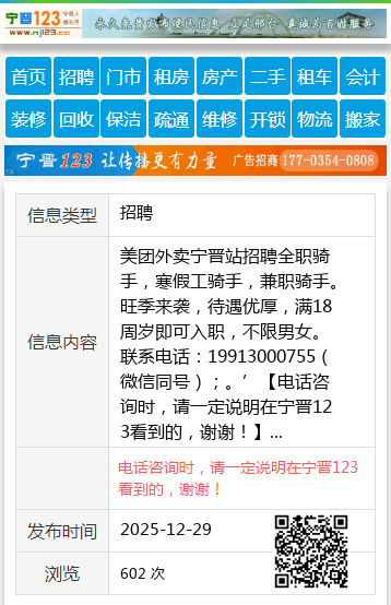 美团外卖宁晋站招聘全职骑手,寒假工骑手,兼职骑手。旺季来袭,待遇优厚,满18周岁即可入职,不限男女。联系电话:19913000755(微信同号);。’ 【电话咨询时,请一定说明在宁晋123看到的,谢谢!】 |