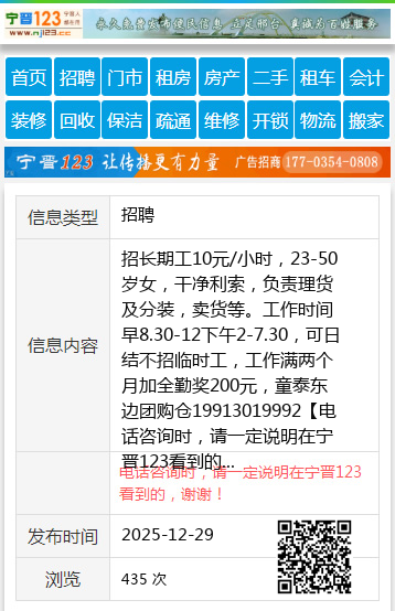 | 防骗提醒: | 宁晋123(www.nj123.cc)提醒您:手工活、网络兼职、刷单,都是骗子!凡以各种名义收取费用的都是骗子!找工作是往兜里挣钱,让你往外掏钱的都是骗子!异地招聘请提高警惕,谨防诈骗! |