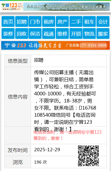 传媒公司招募主播(无需出镜),可兼职日结,简单易学工作轻松,综合工资到手4000-10000,有无经验都可,不限学历。18-38岁,男女不限。联系电话:16768108540微信同号 【电话咨询时,请一定说明在宁晋123看到的,谢谢!】 |