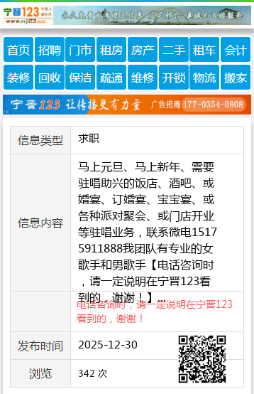 马上元旦、马上新年、需要驻唱助兴的饭店、酒吧、或婚宴、订婚宴、宝宝宴、或各种派对聚会、或门店开业等驻唱业务,联系微电15175911888我团队有专业的女歌手和男歌手 【电话咨询时,请一定说明在宁晋123看到的,谢谢!】 |