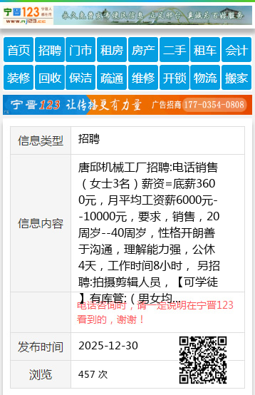 唐邱机械工厂招聘:电话销售(女士3名)薪资=底薪3600元,月平均工资薪6000元--10000元,要求,销售,20周岁--40周岁,性格开朗善于沟通,理解能力强,公休4天,工作时间8小时, 另招聘:拍摄剪辑人员,【可学徒】有库管:(男女均可)工资=3000--5000,经验者优先,工资面议,工作时间8小时,公休4天,法定节假日都放假。 工作地址:唐邱南环路,电话:15612989507 【电话咨询时,请一定说明在宁晋123看到的,谢谢!】 |