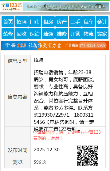 招聘电话销售,年龄23-38周岁,男女均可,底薪面谈。要求:专业性高,具备良好沟通能力和抗压能力,互相配合。岗位实行完整晋升体系,能者多劳多得。联系方式19930722971、18003115456