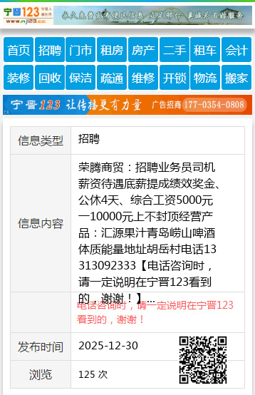 荣腾商贸:招聘业务员司机薪资待遇底薪提成绩效奖金、公休4天、综合工资5000元一10000元上不封顶经营产品:汇源果汁青岛崂山啤酒体质能量地址胡岳村电话13313092333 【电话咨询时,请一定说明在宁晋123看到的,谢谢!】 |