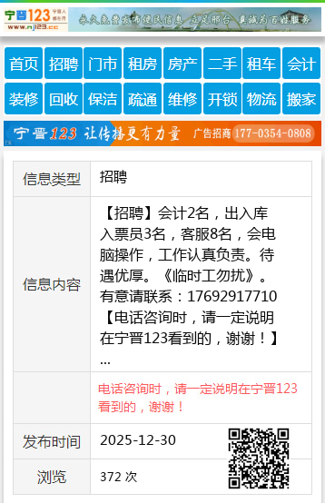 【招聘】会计2名,出入库入票员3名,客服8名,会电脑操作,工作认真负责。待遇优厚。《临时工勿扰》。有意请联系:17692917710 【电话咨询时,请一定说明在宁晋123看到的,谢谢!】 |