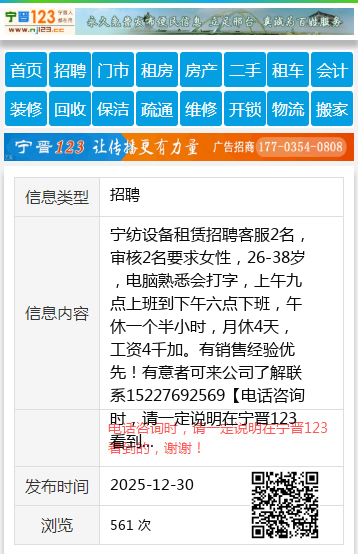 宁纺设备租赁招聘客服2名,审核2名要求女性,26-38岁,电脑熟悉会打字,上午九点上班到下午六点下班,午休一个半小时,月休4天,工资4千加。有销售经验优先!有意者可来公司了解联系15227692569 【电话咨询时,请一定说明在宁晋123看到的,谢谢!】 |