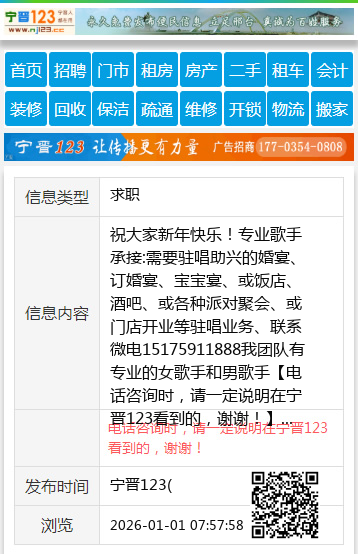 祝大家新年快乐!专业歌手承接:需要驻唱助兴的婚宴、订婚宴、宝宝宴、或饭店、酒吧、或各种派对聚会、或门店开业等驻唱业务、联系微电15175911888我团队有专业的女歌手和男歌手 【电话咨询时,请一定说明在宁晋123看到的,谢谢!】 |