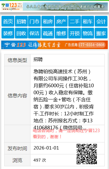 急聘铂悦高速技术(苏州)有限公司车间操作工30名,月薪约6000元(住宿补贴1000元)收入稳定有保障。缴纳五险一金+管吃(不含住宿).要求30岁以内,积极肯干.工作时长:12小时制工作地点:苏州报名方式:李13410688176(微信同号)