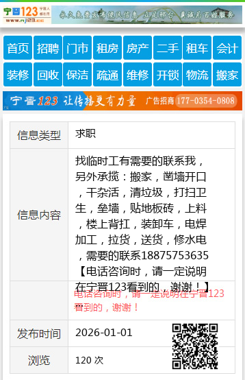 找临时工有需要的联系我,另外承揽:搬家,凿墙开口,干杂活,清垃圾,打扫卫生,垒墙,贴地板砖,上料,楼上背扛,装卸车,电焊加工,拉货,送货,修水电,需要的联系18875753635 【电话咨询时,请一定说明在宁晋123看到的,谢谢!】 |