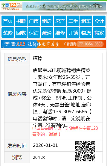 唐邱宝成电缆诚聘销售精英,要求:女年龄25-35岁,五官端正,有电缆销售经验者优先薪资待遇:底薪3000+提成+奖金,8小时工作制,公休4天,无需出差!地址:唐邱镇,电话:139-3097-6666 【电话咨询时,请一定说明在宁晋123看到的,谢谢!】 |