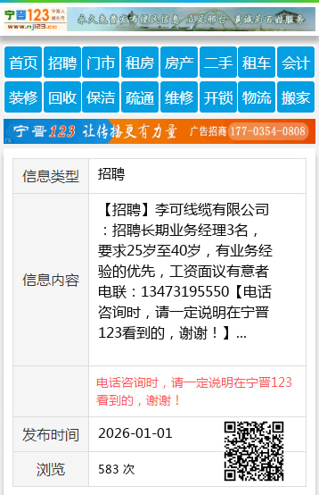 李可线缆有限公司:招聘长期业务经理3名,要求25岁至40岁,有业务经验的优先,工资面议有意者电联:13473195550 【电话咨询时,请一定说明在宁晋123看到的,谢谢!】 |