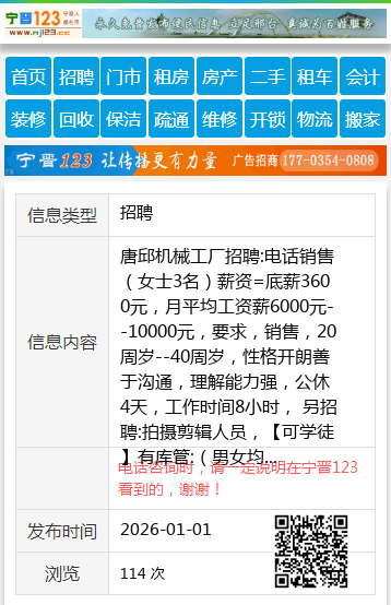 唐邱机械工厂招聘:电话销售(女士3名)薪资=底薪3600元,月平均工资薪6000元--10000元,要求,销售,20周岁--40周岁,性格开朗善于沟通,理解能力强,公休4天,工作时间8小时, 另招聘:拍摄剪辑人员,【可学徒】有库管:(男女均可)工资=3000--5000,经验者优先,工资面议,工作时间8小时,公休4天,法定节假日都放假。 工作地址:唐邱南环路,电话:15612989507 【电话咨询时,请一定说明在宁晋123看到的,谢谢!】 |