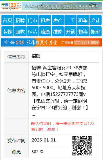 招聘-淘宝客服女20-38岁熟练电脑打字,接受早晚班,有责任心,公休2天,工资3500~5000。地址方大科技园。电话15227727773同v 【电话咨询时,请一定说明在宁晋123看到的,谢谢!】 |