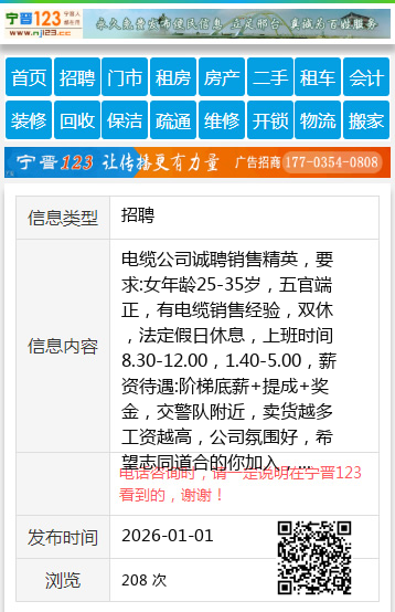 电缆公司诚聘销售精英,要求:女年龄25-35岁,五官端正,有电缆销售经验,双休,法定假日休息,上班时间8.30-12.00,1.40-5.00,薪资待遇:阶梯底薪+提成+奖金,交警队附近,卖货越多工资越高,公司氛围好,希望志同道合的你加入,联系电话15130923375 【电话咨询时,请一定说明在宁晋123看到的,谢谢!】 |