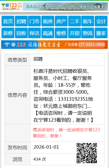 杉鼎汗蒸时代招聘收银员、服务员、小时工、餐厅服务员。年龄:18-55岁,管吃住,综合薪资3000-5000。咨询电话:13313192351地址:状元路上城御府东门... 【电话咨询时,请一定说明在宁晋123看到的,谢谢!】 |