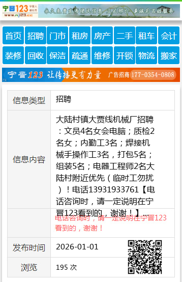 大陆村镇大贾线机械厂招聘:文员4名女会电脑;质检2名女;内勤工3名;焊接机械手操作工3名,打包5名;组装5名;电器工程师2名大陆村附近优先(临时工勿扰)!电话13931933761 【电话咨询时,请一定说明在宁晋123看到的,谢谢!】 |