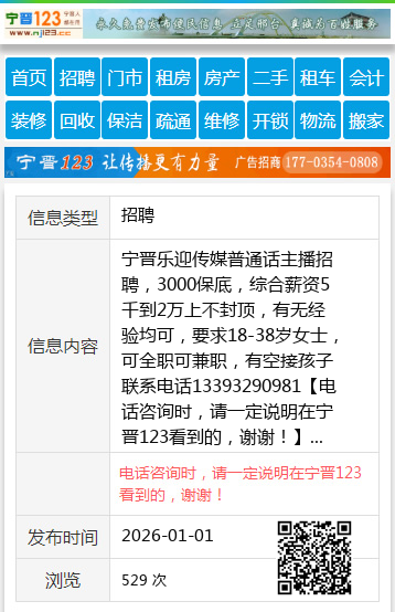 宁晋乐迎传媒普通话主播招聘,3000保底,综合薪资5千到2万上不封顶,有无经验均可,要求18-38岁女士,可全职可兼职,有空接孩子联系电话13393290981 【电话咨询时,请一定说明在宁晋123看到的,谢谢!】 |