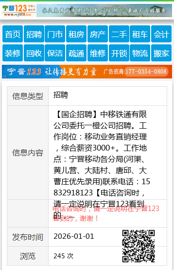 【国企招聘】中移铁通有限公司委托一橙公司招聘。工作岗位:移动业务直销经理,综合薪资3000+。工作地点:宁晋移动各分局(河渠、黄儿营、大陆村、唐邱、大曹庄优先录用)联系电话:15832918123 【电话咨询时,请一定说明在宁晋123看到的,谢谢!】 |