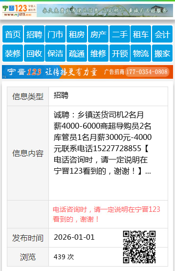 诚聘:乡镇送货司机2名月薪4000-6000商超导购员2名库管员1名月薪3000元-4000元联系电话15227728855