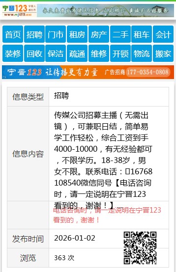 传媒公司招募主播(无需出镜),可兼职日结,简单易学工作轻松,综合工资到手4000-10000,有无经验都可,不限学历。18-38岁,男女不限。联系电话:16768108540微信同号 【电话咨询时,请一定说明在宁晋123看到的,谢谢!】 |