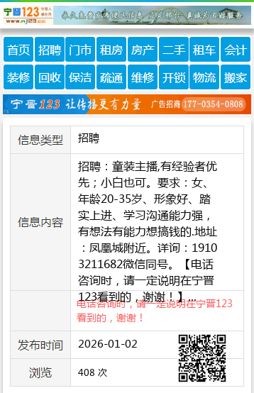 招聘:童装主播,有经验者优先;小白也可。要求:女、年龄20-35岁、形象好、踏实上进、学习沟通能力强,有想法有能力想搞钱的.地址:凤凰城附近。详询:19103211682微信同号。 【电话咨询时,请一定说明在宁晋123看到的,谢谢!】 |