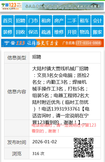 大陆村镇大贾线机械厂招聘:文员3名女会电脑;质检2名女;内勤工3名;焊接机械手操作工3名,打包5名;组装5名;电器工程师2名大陆村附近优先(临时工勿扰)!电话13931933761 【电话咨询时,请一定说明在宁晋123看到的,谢谢!】 |