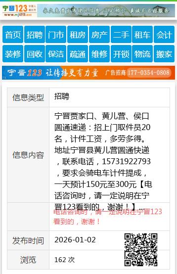 宁晋贾家口、黄儿营、侯口圆通速递:招上门取件员20名,计件工资,多劳多得。地址宁晋县黄儿营圆通快递,联系电话,15731922793