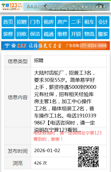 大陆村齿轮厂,招普工3名,要求30至55岁。简单易学好上手,薪资待遇5000到9000元有社保,招有相关经验库房主管1名,加工中心操作工2名,箱体组装工2名,普车操作工1名。电话19103399867 【电话咨询时,请一定说明在宁晋123看到的,谢谢!】 |