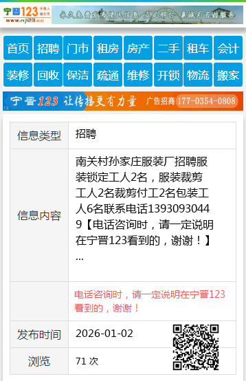 南关村孙家庄服装厂招聘服装锁定工人2名,服装裁剪工人2名裁剪付工2名包装工人6名联系电话13930930449