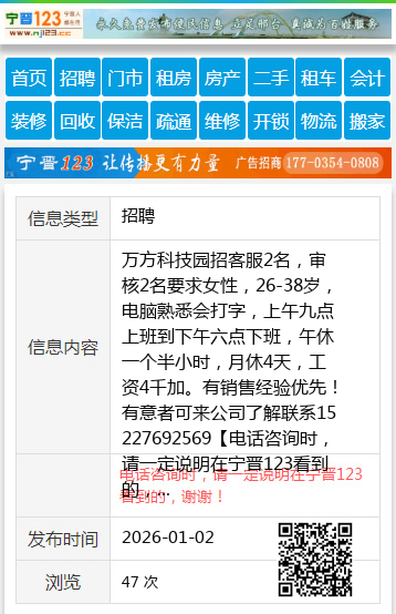 万方科技园招客服2名,审核2名要求女性,26-38岁,电脑熟悉会打字,上午九点上班到下午六点下班,午休一个半小时,月休4天,工资4千加。有销售经验优先!有意者可来公司了解联系15227692569 【电话咨询时,请一定说明在宁晋123看到的,谢谢!】 |