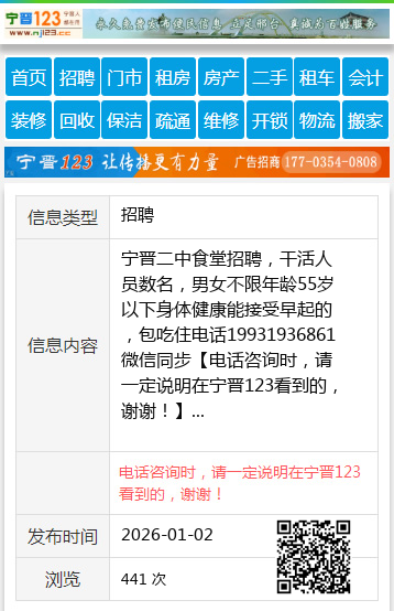 宁晋二中食堂招聘,干活人员数名,男女不限年龄55岁以下身体健康能接受早起的,包吃住电话19931936861微信同步