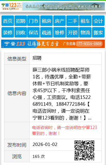 薛三郎小锅米线招聘配菜师1名,待遇优厚,全勤+带薪休假+节日机制奖励等,要求45岁以下,干净利索责任心强,工资面议。电话15226891149、18847721846 【电话咨询时,请一定说明在宁晋123看到的,谢谢!】 |