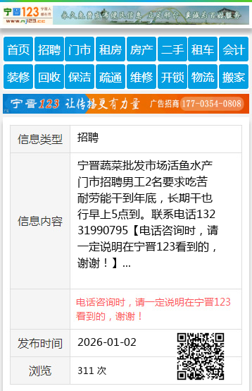 宁晋蔬菜批发市场活鱼水产门市招聘男工2名