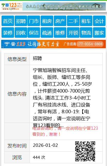 宁晋旭瑞智裤招车间主任、组长、版师、缝纫工等多岗位,缝纫工200人,25-50岁,计件薪资4000-7000元