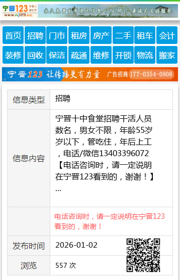 宁晋十中食堂招聘干活人员数名,男女不限,年龄55岁岁以下,管吃住,年后上工,电话/微信 13403396072