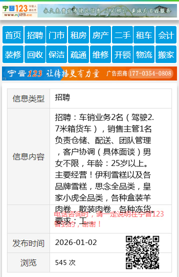 招聘:车销业务2名(驾驶2.7米箱货车),