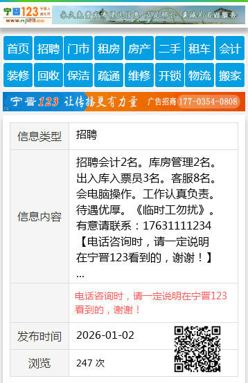 招聘会计2名。库房管理2名。出入库入票员3名。客服8名。会电脑操作。工作认真负责。待遇优厚。《临时工勿扰》。有意请联系:17631111234 【电话咨询时,请一定说明在宁晋123看到的,谢谢!】 |