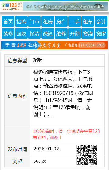 极兔招聘夜班客服,下午3点上班。公休两天。工作地点:韵泽通物流园。联系电话:15031920719(微信同号)