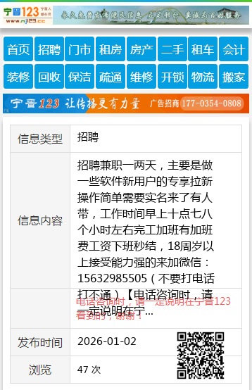 招聘兼职一两天,主要是做一些软件新用户的专享拉新操作简单需要实名来了有人带,工作时间早上十点七八个小时左右完工加班有加班费工资下班秒结,18周岁以上接受能力强的来加微信:15632985505(不要打电话打不通) 【电话咨询时,请一定说明在宁晋123看到的,谢谢!】 |