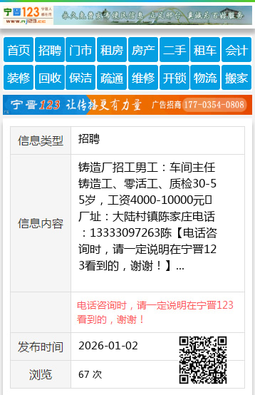| 防骗提醒: | 宁晋123(www.nj123.cc)提醒您:手工活、网络兼职、刷单,都是骗子!凡以各种名义收取费用的都是骗子!找工作是往兜里挣钱,让你往外掏钱的都是骗子!异地招聘请提高警惕,谨防诈骗! |