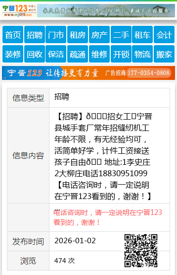 【招聘】🎉招女工✅宁晋县城手套厂常年招缝纫机工年龄不限,有无经验均可,活简单好学,计件工资接送孩子自由🏠地址:1李史庄2大柳庄电话18830951099 【电话咨询时,请一定说明在宁晋123看到的,谢谢!】 |