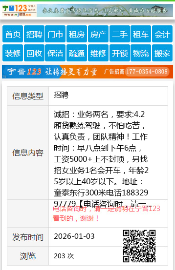 诚招:业务两名,要求:4.2厢货熟练驾驶,不怕吃苦,认真负责,团队精神!工作时间:早八点到下午6点,工资5000+上不封顶,另找招女业务1名会开车,年龄25岁以上40岁以下。地址:童泰东行300米电话18832997779 【电话咨询时,请一定说明在宁晋123看到的,谢谢!】 |