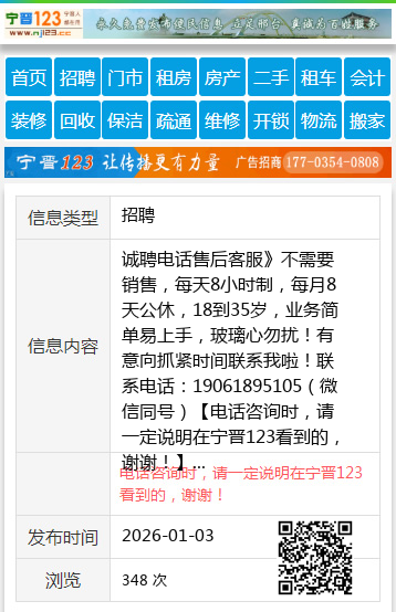 | 防骗提醒: | 宁晋123(www.nj123.cc)提醒您:手工活、网络兼职、刷单,都是骗子!凡以各种名义收取费用的都是骗子!找工作是往兜里挣钱,让你往外掏钱的都是骗子!异地招聘请提高警惕,谨防诈骗! |