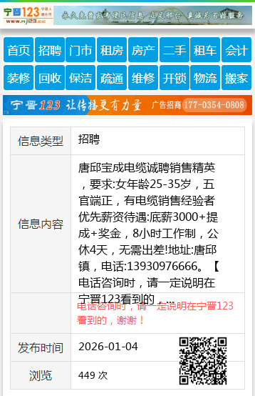 唐邱宝成电缆诚聘销售精英,要求:女年龄25-35岁,五官端正,有电缆销售经验者优先薪资待遇:底薪3000+提成+奖金,8小时工作制,公休4天,无需出差!地址:唐邱镇,电话:13930976666。 【电话咨询时,请一定说明在宁晋123看到的,谢谢!】 |