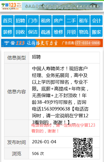 中国人寿聘英才!现招客户经理、业务拓展岗,高中及以上学历即可报名,专业不限。底薪+高提成+年终奖,无责保障+上不封顶收!年龄38-49岁均可报名,咨询电话15630990638 【电话咨询时,请一定说明在宁晋123看到的,谢谢!】 |