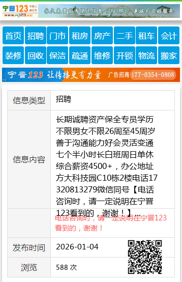 长期诚聘资产保全专员学历不限男女不限26周至45周岁善于沟通能力好会灵活变通七个半小时长白班周日单休综合薪资4500+,办公地址方大科技园C10栋2楼电话17320813279微信同号 【电话咨询时,请一定说明在宁晋123看到的,谢谢!】 |