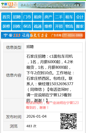 石家庄招聘:c1面包车司机,1名,月薪6000起,4.2米箱货,1名,月薪8000起,下午2点到10点。工作地址:石家庄桥西区。包吃住。联系人:裴经理15032696377(同微信) 【电话咨询时,请一定说明在宁晋123看到的,谢谢!】 |