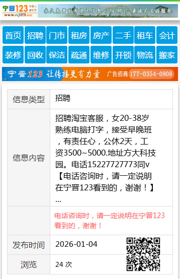 招聘淘宝客服,女20-38岁熟练电脑打字,接受早晚班,有责任心,公休2天,工资3500~5000.地址方大科技园。电话15227727773同v 【电话咨询时,请一定说明在宁晋123看到的,谢谢!】 |